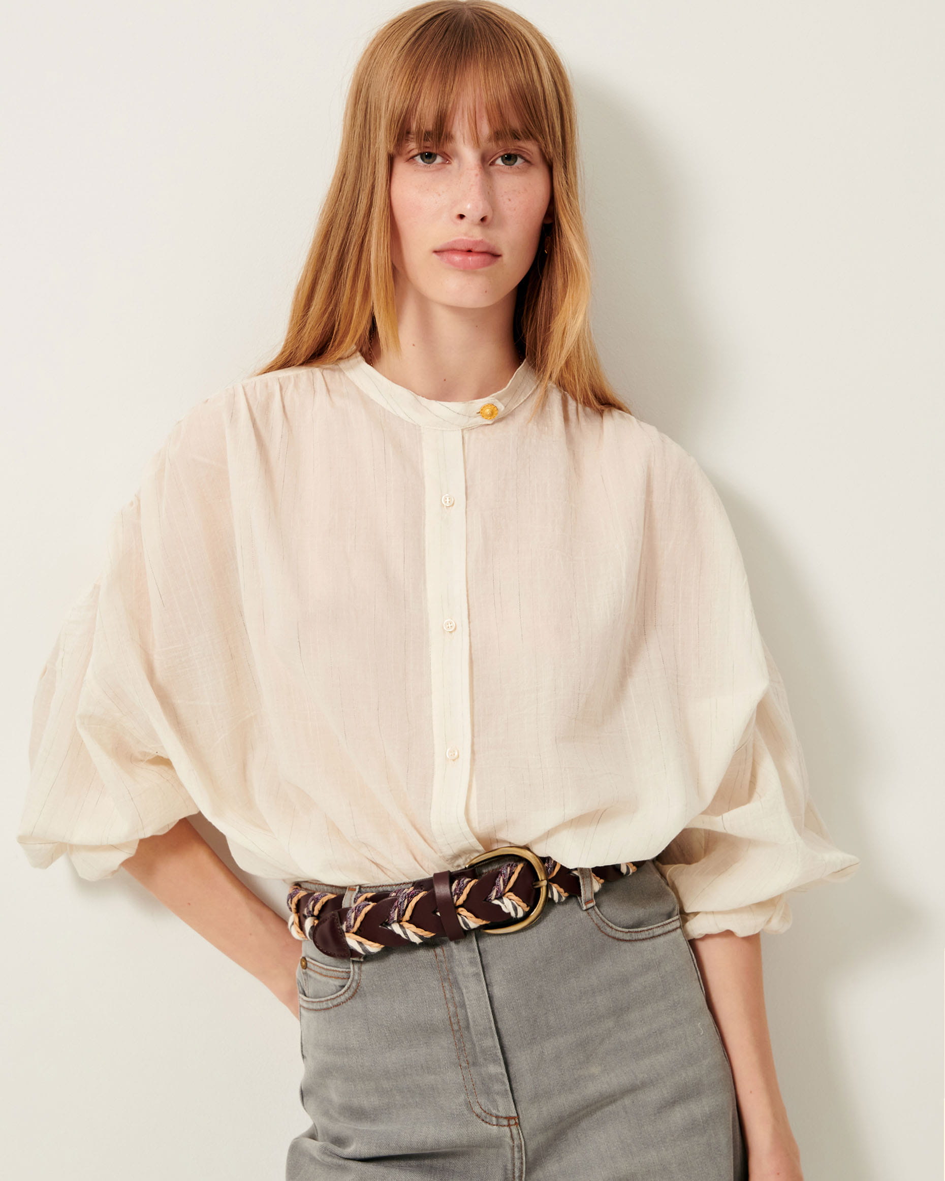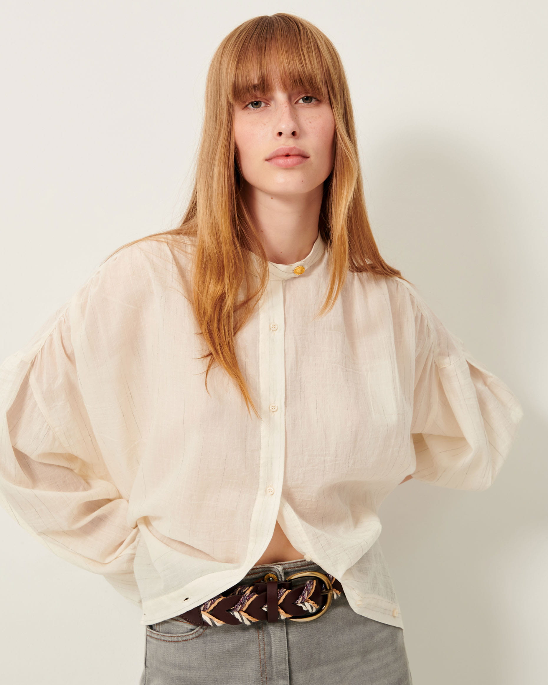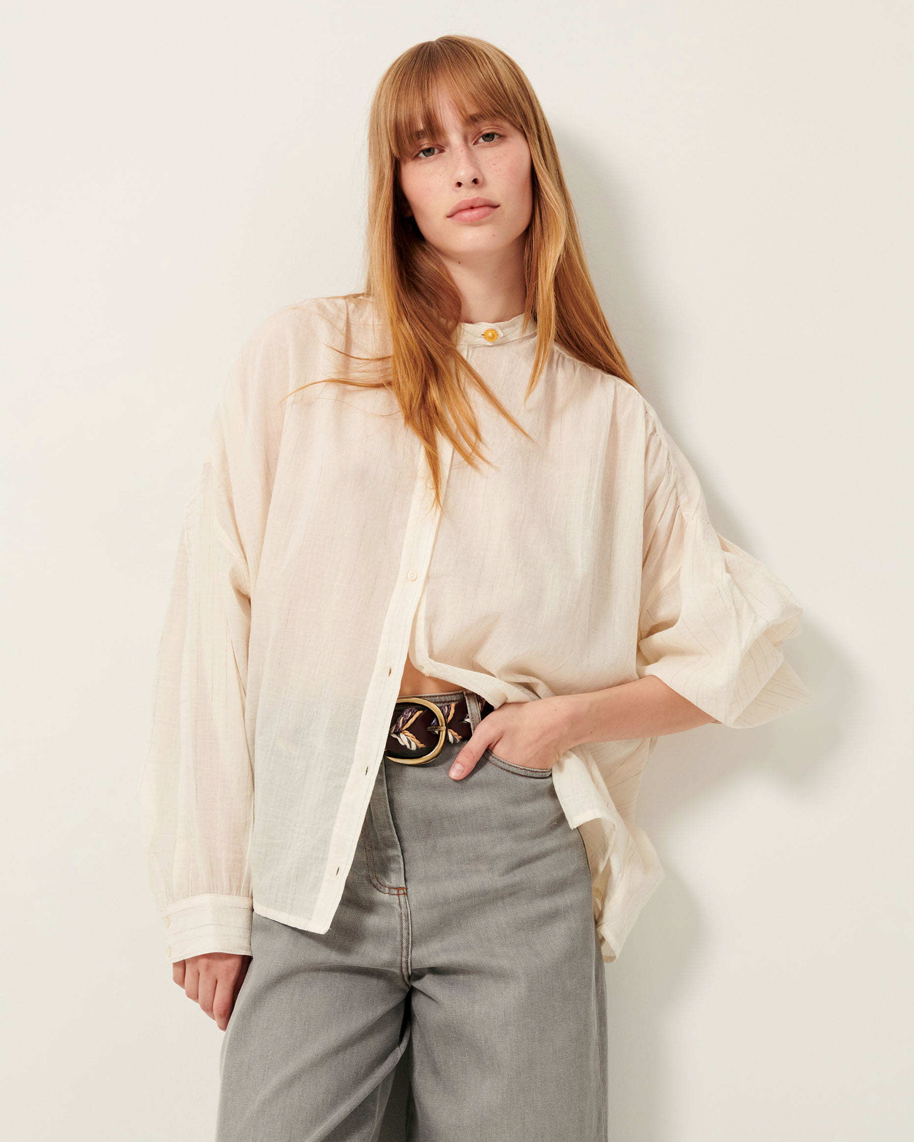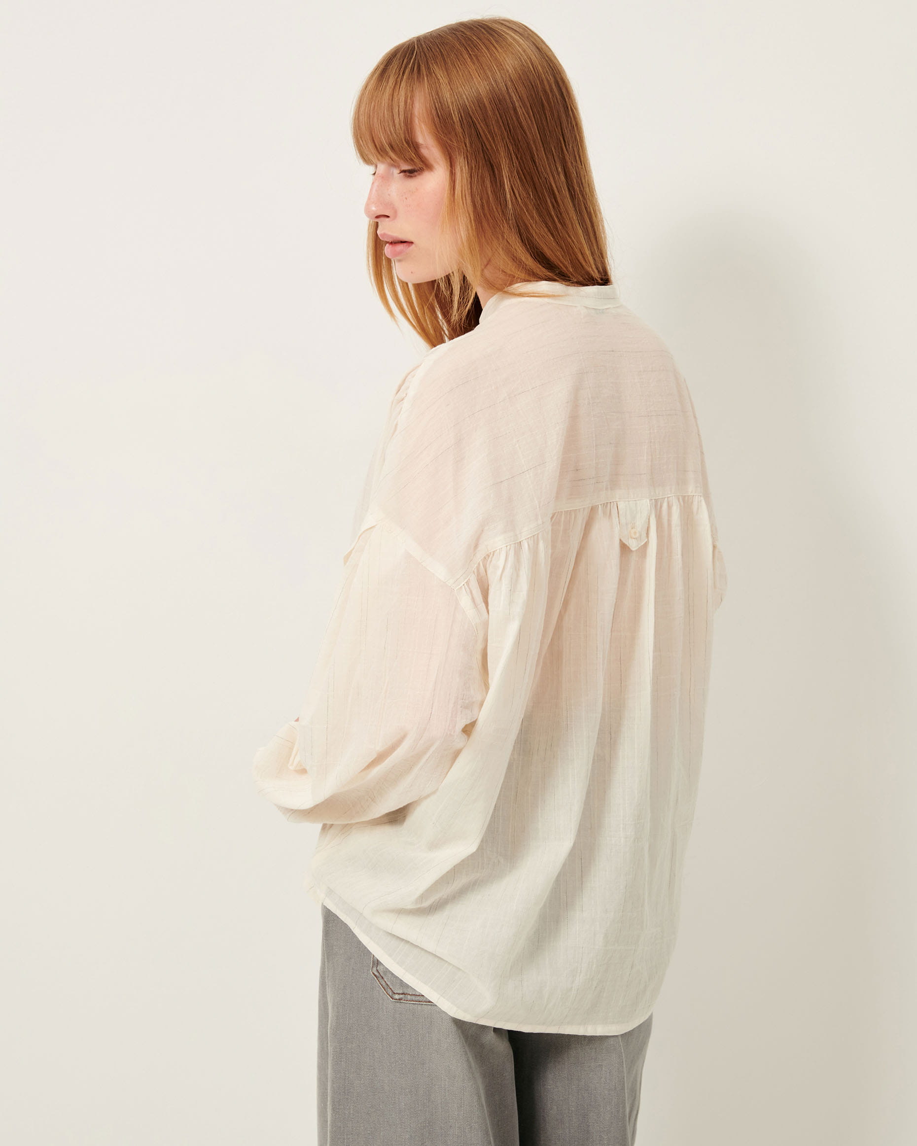 Loose-fitting artist-style blouse with a round neck in transparent cotton voile with fine slub yarn stripes, woven in Italy.Lotte is 175 cm and is wearing an S.Button front closure with a jewel button tab at the collar.Drop shoulders.Long sleeves.Yoke with gathering at the back with a button tab detail.Gathering details at the shoulders.99% Cotton 1% PolyesterMade in Morocco