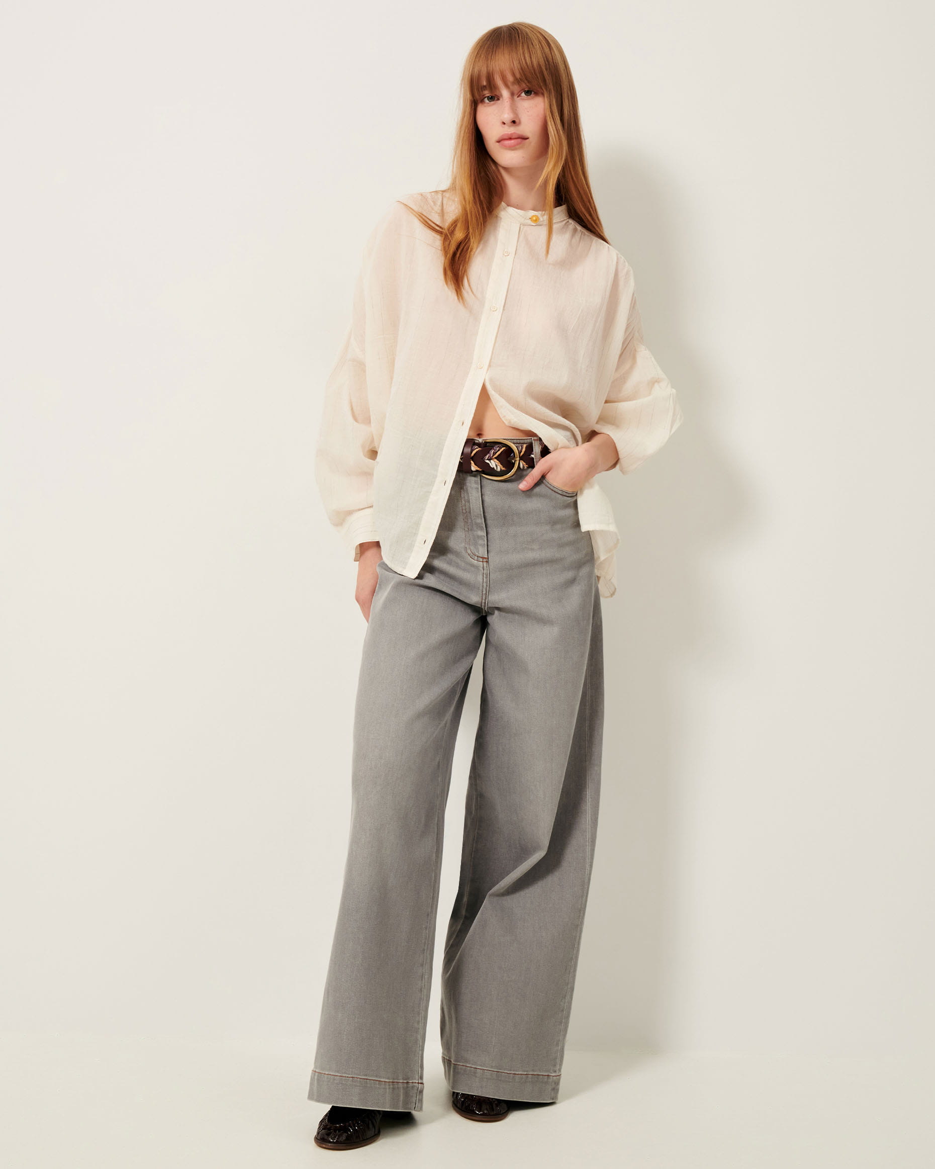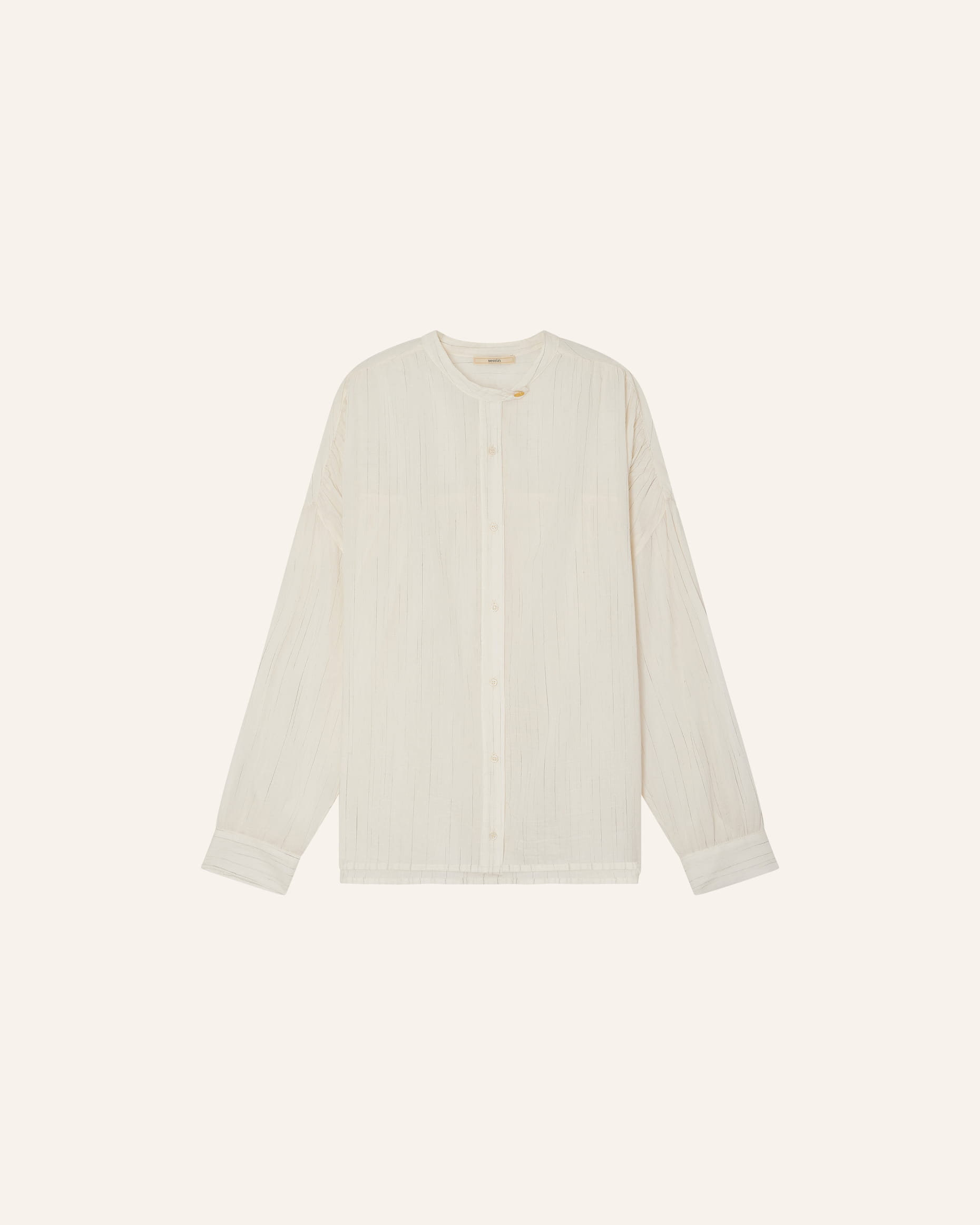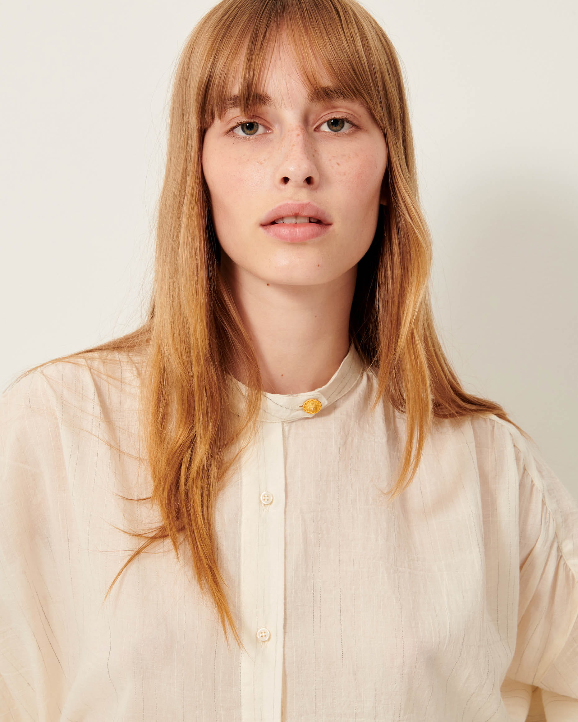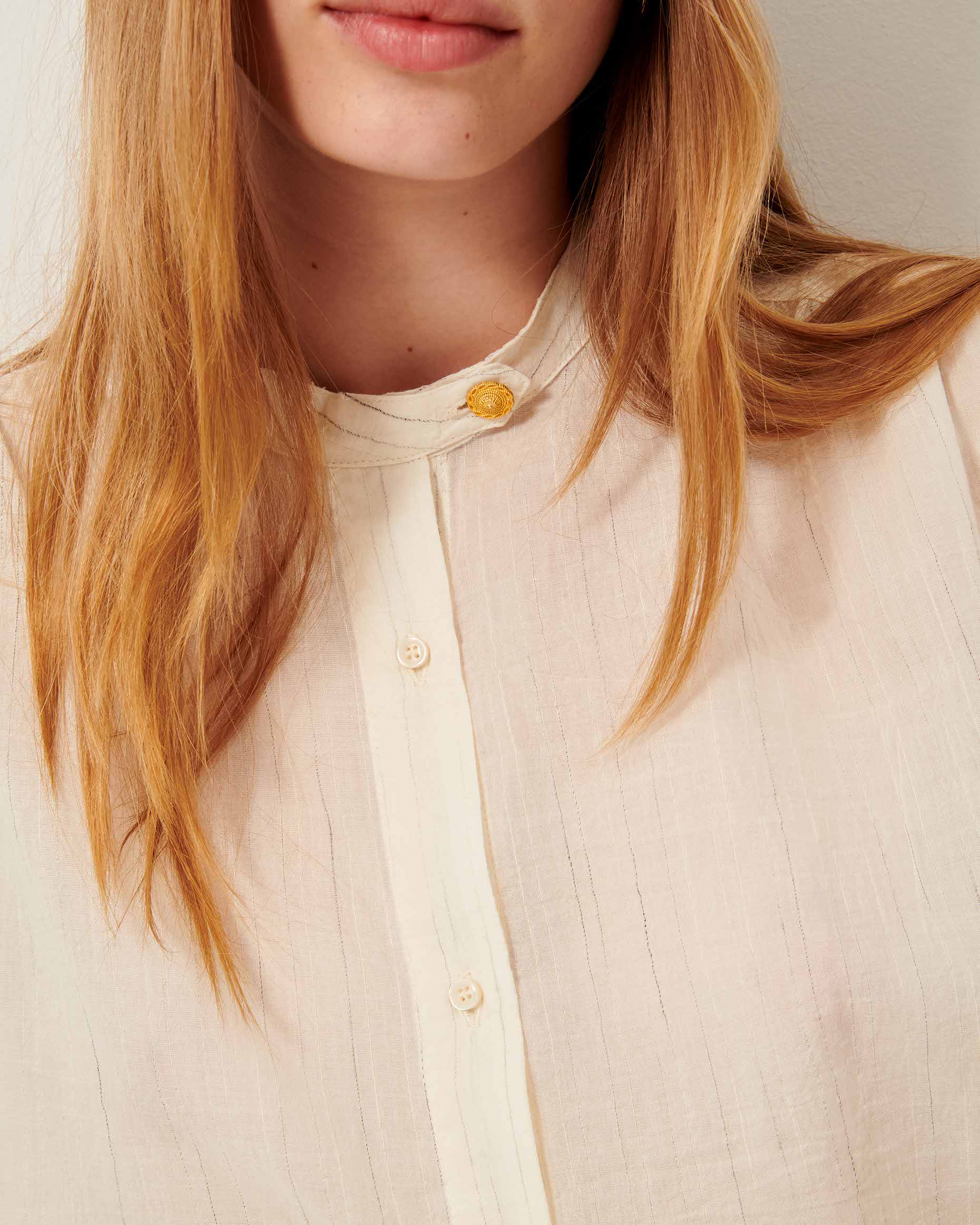 Loose-fitting artist-style blouse with a round neck in transparent cotton voile with fine slub yarn stripes, woven in Italy.Lotte is 175 cm and is wearing an S.Button front closure with a jewel button tab at the collar.Drop shoulders.Long sleeves.Yoke with gathering at the back with a button tab detail.Gathering details at the shoulders.99% Cotton 1% PolyesterMade in Morocco